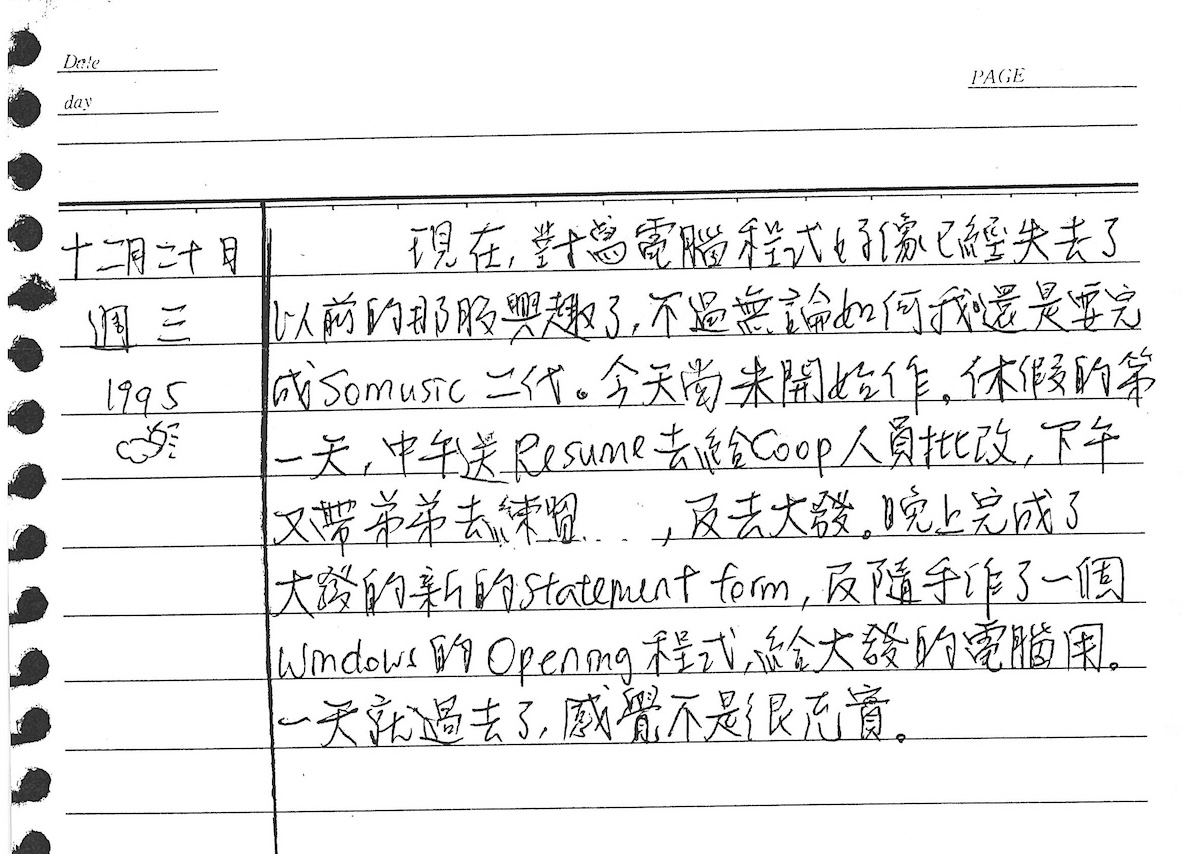 以下是30年前的今天(1995年12月20日)當時19歲的我所親筆寫下的日記: