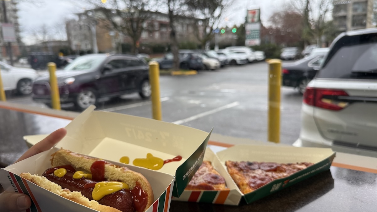 等房子的時候我們到旁邊7-11,妹妹看著熱狗,她居然願意吃,我才想起這不就是台灣7-11的大亨堡麼!再加上在打折的兩片pizza,總共七元多,外面玻璃牆邊坐著一個白人胖胖的流浪漢,也坐著吃東西。
