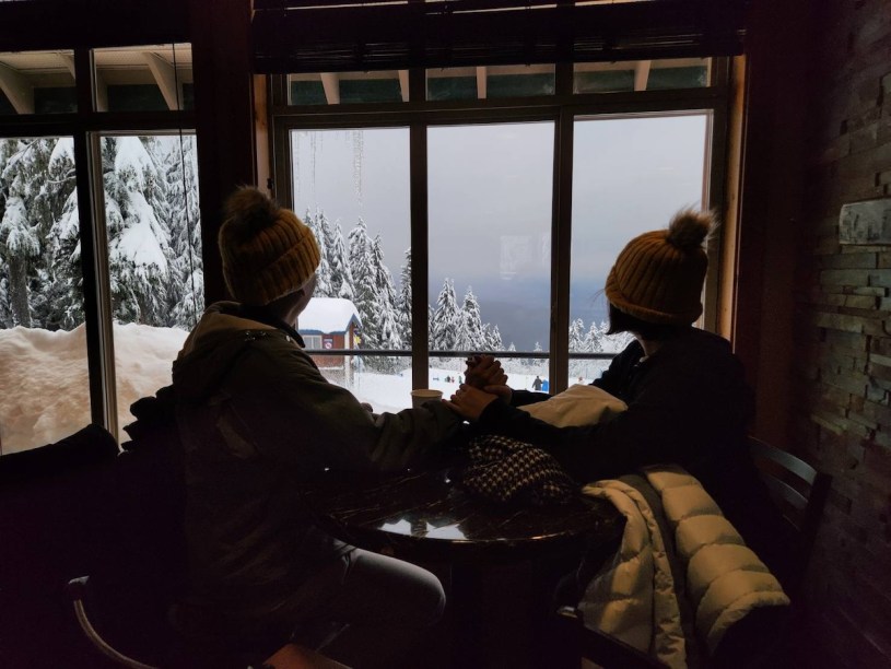今天好隊友建議可去Mount Seymour。我們曾去過另外二山:Grouse Mountain、Cypress,從沒有去過這個Seymour。從北溫要到Seymour還需要30分鐘,大部分的路都還沒有任何雪,原本以為就沒雪,但一轉彎,開始有些白色點點在路邊,瞬時,開始有白色在樹上,然後越來越多越來越多。