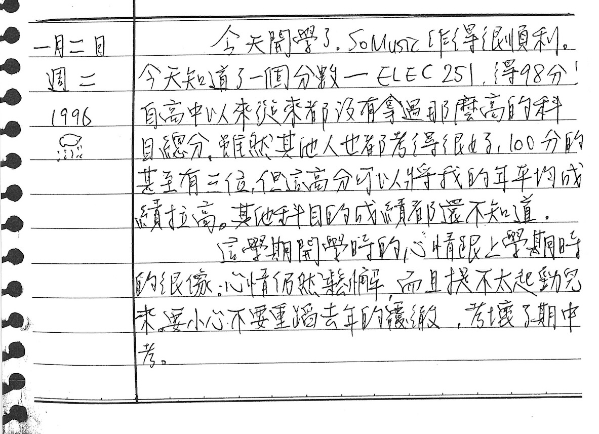 以下是30年前的今天(1996年1月2日)當時19歲的我所親筆寫下的日記: