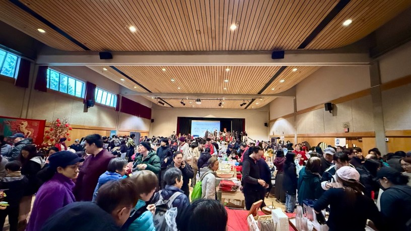 今天行程來到很期待的台灣商會「市集」,在這個Nikkei Centre裡,攤位應該有20攤以上,不意外,這種場合、這種氣氛,「吃」的攤位非常吃香,第一攤是「志同稻合」,然後是「Too Good」咖啡,可是我們真正買超多東西的右邊第三攤、沒聽過名字的新團購網,三個媽媽在那邊吆喝,她們住南素里,是鄰居一起創業,去年11月(兩個月前)才剛開團,現在三百多人。來這裡擺攤顯然是對的,因為她們臭豆腐、素羹都很好吃,肉粽兩顆11塊,也是素的,其中一位姓陳的吃素年輕媽媽說,這些都是她煮的。