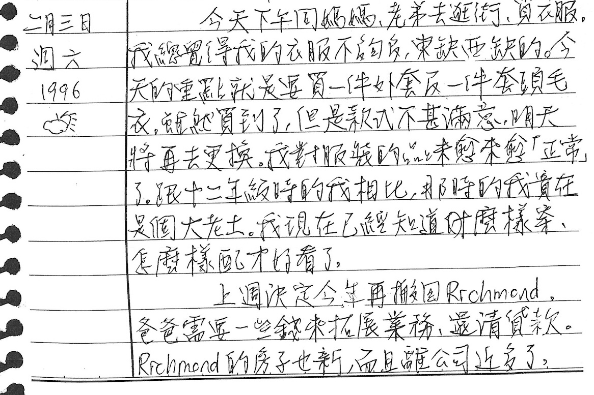 這天記錄了一件有趣的事──原來在我們搬至較貴的豪宅區新家之後,一度考慮「今年再搬回Richmond」,可能是因為爸爸需要現金來拓展新買的工廠的業務,且我們對舊房子可能已有點不習慣,且離工廠近。不過,顯然後來並沒有搬。