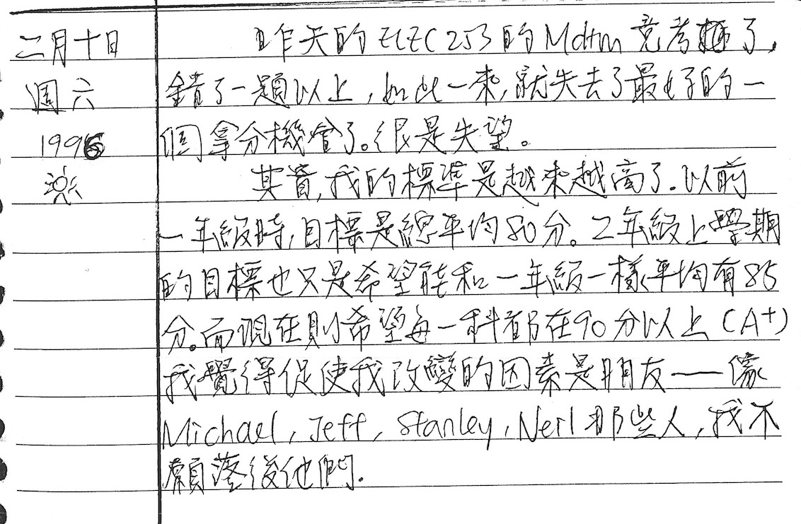以下是30年前的今天(1996年2月11日)當時19歲的我所親筆寫下的日記:
