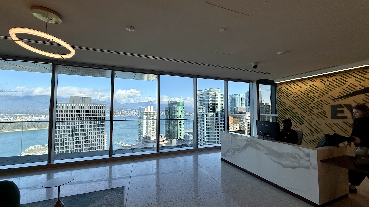 早上與好隊友來downtown,在陽光下,這一條Dunsmir非常漂亮,旋轉餐廳看起來頭特別的大、特別立體,其他大樓又有玻璃又有水泥的,整條街非常美,來到1177號的19樓,這種沒有按鈕的電梯我在台北搭慣並不覺得陌生,但19樓的樣子就讓我吃驚,接待桌旁任何裝飾,只有一大片的直望海灣的大窗,馬上示意一切,想多人都和我一樣問了receptionist可不可以拍照吧?