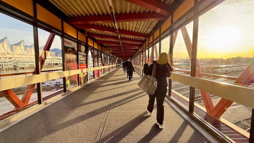 外面氣溫兩度,天色大概半亮,早上大約6:35起床,淋浴17分鐘,7:22抵達公車站。7:33抵達天車站,7:37上天車。坐到了倒數第幾個位子,8:05抵達終點站Waterfront,8:09走抵Seabus港口,8:16坐好在Seabus裡,8:27抵達,並且在外面走著,8:31上計程車,8:43分前就到公司了。所以從家裡到公司等於是1小時20分鐘。