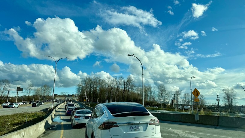 溫哥華的上班車流,一直開到1街之前,路都還是很空的,到北溫大概有100條走法,Google Maps看哪邊比較空。路面白白的,偶爾高低差,看到美麗的全景,前面有高山,有Skytrain從左右橫切過去,有時運氣好還看到純白色的一串長長的車廂。