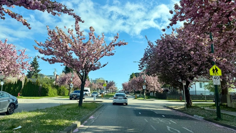 回家的路上,溫哥華天氣晴朗,沿途感覺到明顯的深粉紅色的櫻花又開更大了,雖然淡白色的櫻花更漂亮,但後面接手的深粉紅色的櫻花,可以開到滿天都是,現在已開始飄「櫻花雨」,但是櫻花雨就跟雨與雪,都拍不進相機,我們又在路上,漂亮的樹總是在路旁,也沒辦法真的拍下來,每次拍下來都沒有眼睛好看,沒辦法用在日記裡面當Cover Photo。