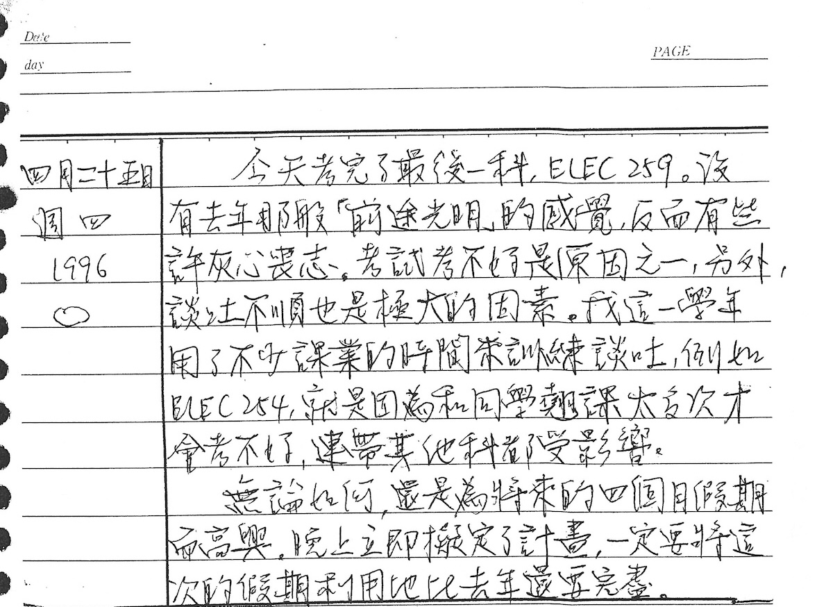 以下是30年前的今天(1996年4月25日)當時19歲的我所親筆寫下的日記: