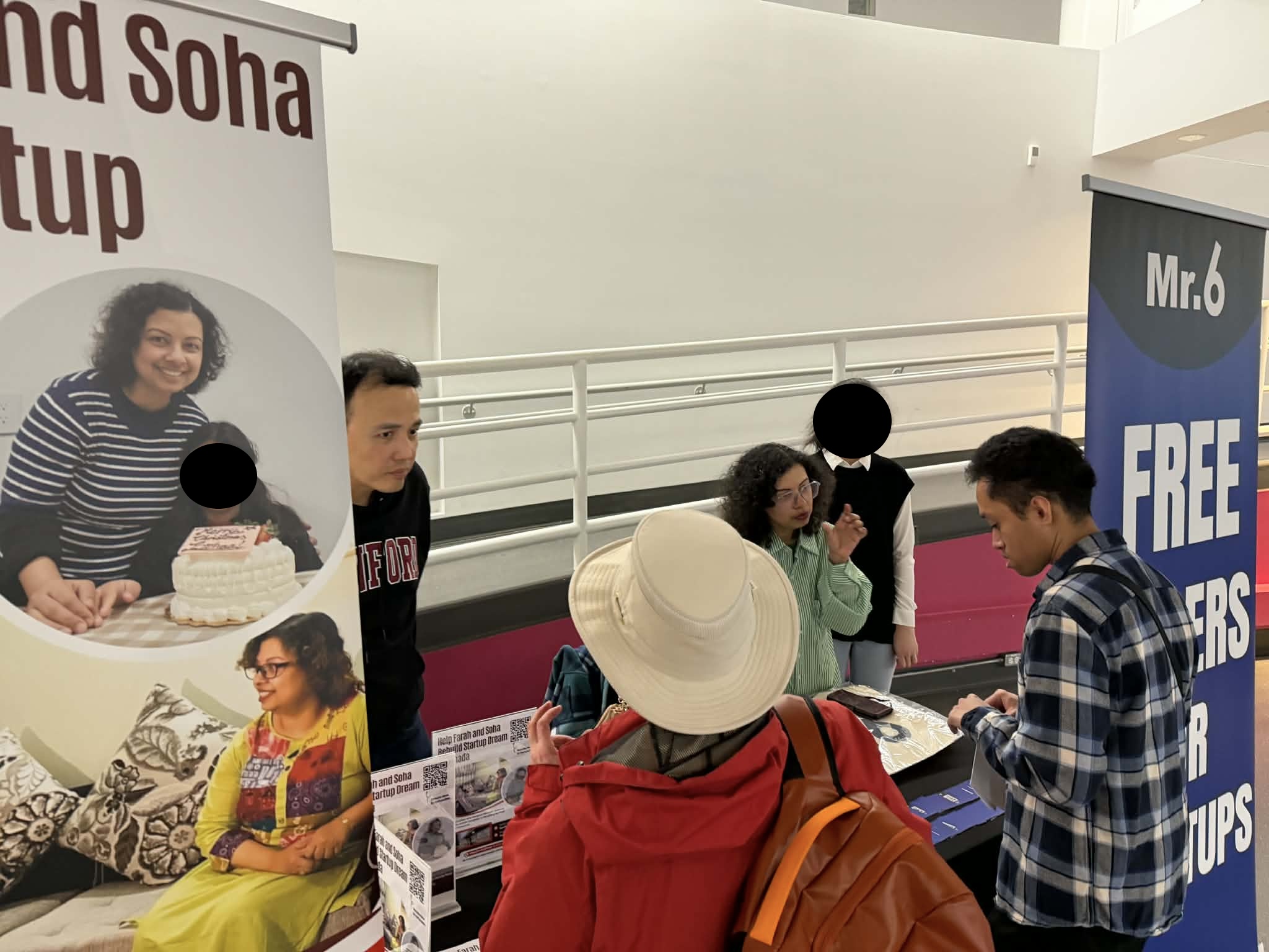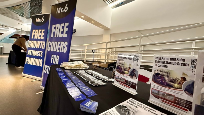 下午,到Science World時,其實仍很多很多時間,我們推大推車進去,推車上面一盒東西還有三條長長的易拉展,現場他們帶我們去桌子,有人就在路口進來、直直的正對面,還不錯,只可惜燈光昏暗,找到一個聚光燈就讓其中一個易拉展可以打上去,三張易拉展海報都有點昏暗,但是三張排開,還算有點陣形。