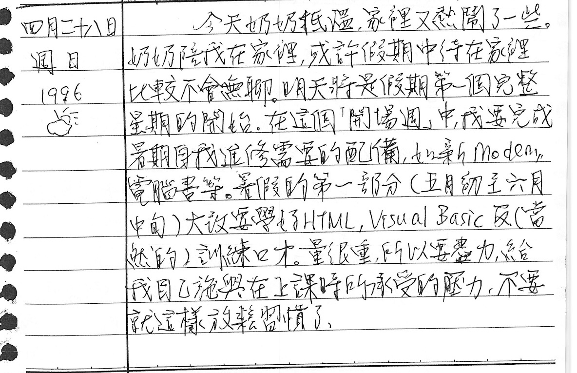 以下是30年前的今天(1996年4月28日)當時19歲的我所親筆寫下的日記: