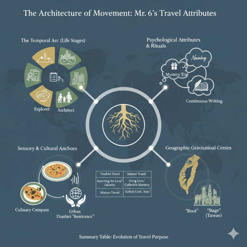 在Mr. 6的三十三年旅遊書寫中,台灣作為精神重力中心,從未真正移位。無論他走到多遠,最後那條引力線,始終牽引著他——回家。這或許就是這部移動史詩最深刻的啟示:旅行的意義,從來不只在於到達遠方,而在於從遠方更清晰地看見自己,看見自己從哪裡來,以及——心,究竟停在哪裡。